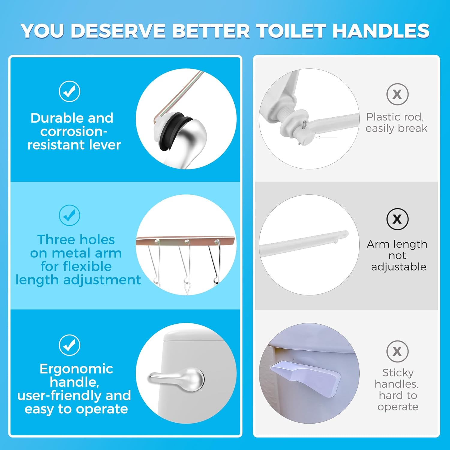 - [EFFICIENT FLUSHING] Designed for smooth operation and reliable flushing, this toilet tank lever is easy to use for everyone, including children, seniors, and individuals with limited hand strength or arthritis. Say goodbye to sticky, broken, or corroded handles, and enjoy a sleek design that complements any bathroom decor.