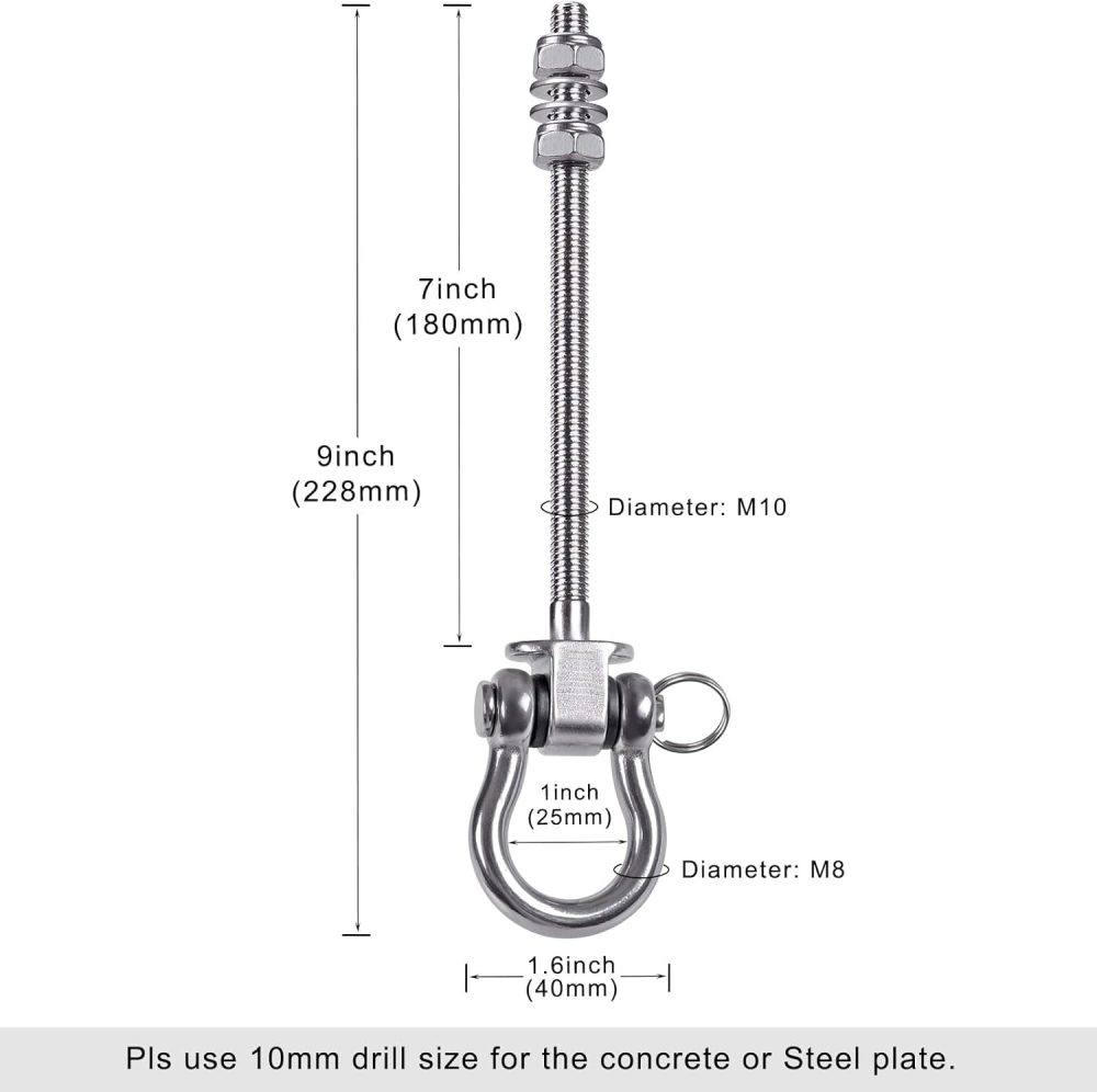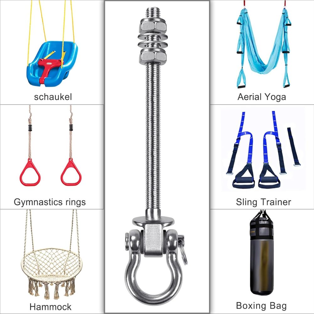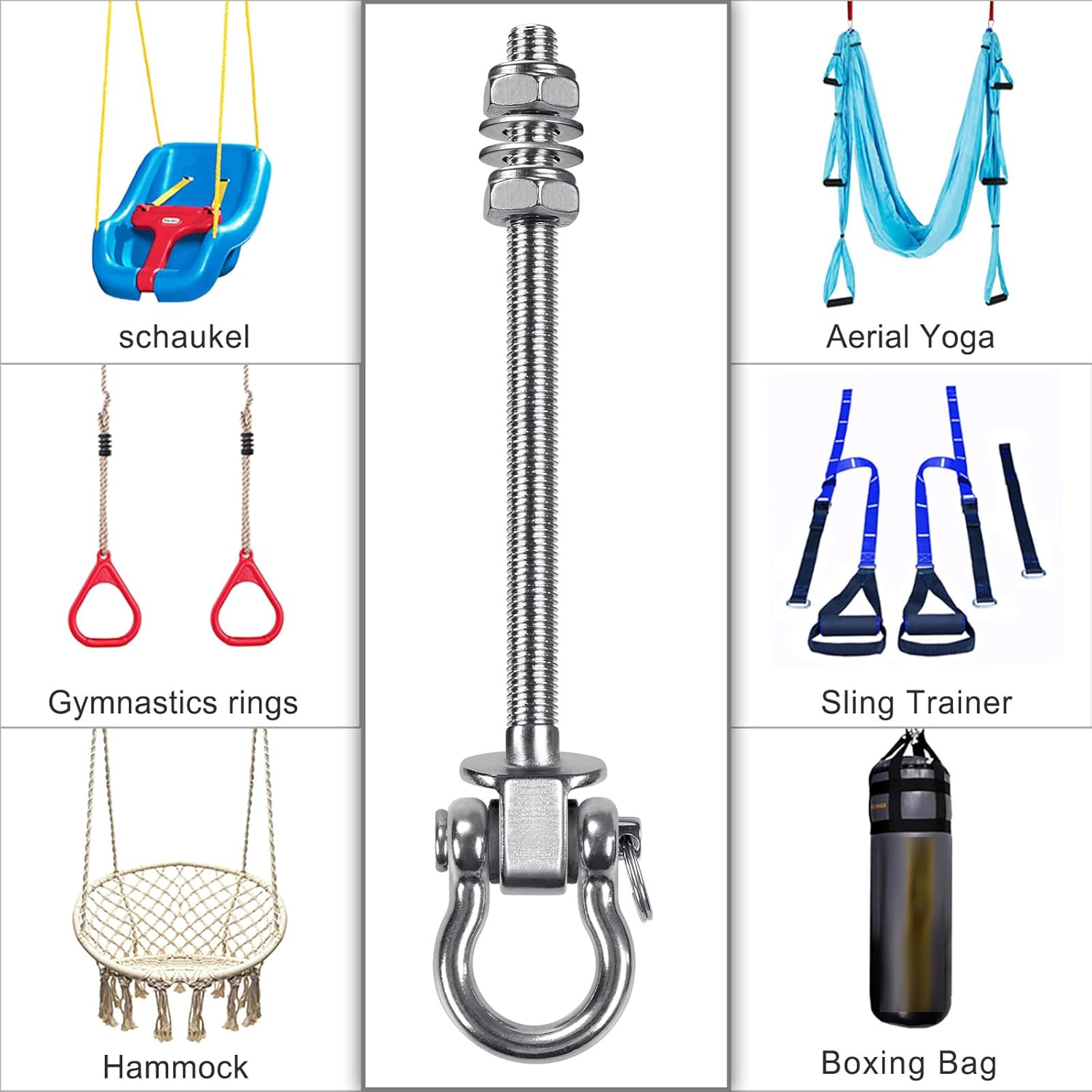 • 🛠【Quick and Simple Installation】No need for complicated tools or skills. Just drill a pilot hole in the wood or metal beam, insert the screws and washers, tighten the nuts and you’re done. The swing ring can be detached for easy connection with any chain, rope or buckle.