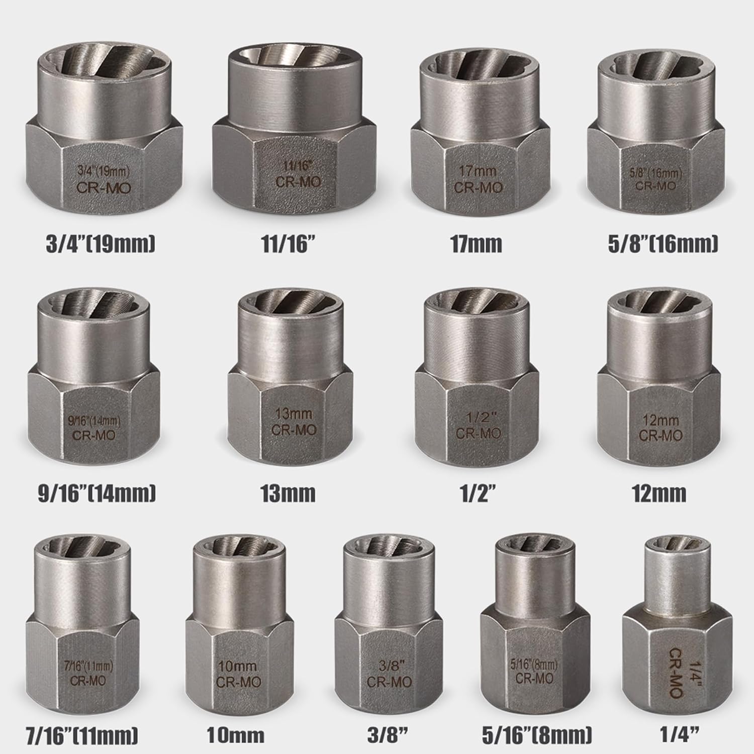 • 13 pieces 3/8 inch drive bolt & nut remover comes with 3/4″(19mm), 11/16″, 17mm, 5/8″(16mm), 9/16″(14mm), 13mm, 1/2″, 12mm, 7/16″(11mm), 10mm, 3/8″, 5/16″(8mm), 1/4″